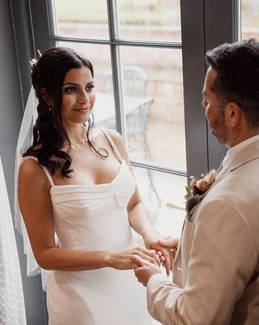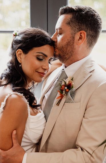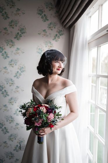 Bride in a white gown holding a vibrant autumn bouquet by a window.