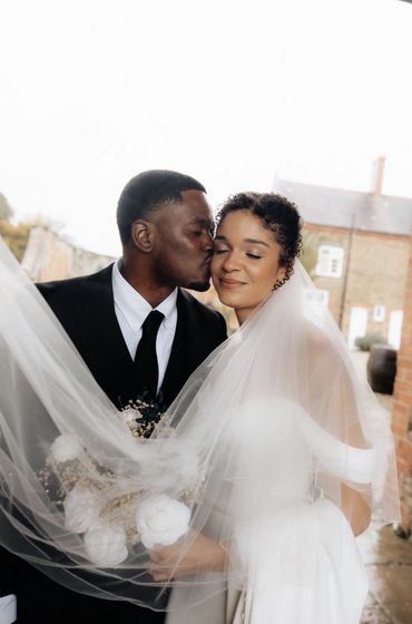 Newlyweds share a joyful embrace and kiss outdoors surrounded by greenery.